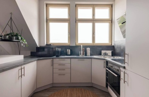 Travel with ease thanks to ample storage options, including high-quality wardrobes, dressers, and cabinets. Whether you’re here for a weekend or a longer stay, there’s plenty of room for your belongings. The apartment is located on the top floor and is easily accessible via two large elevators or two staircases. The accessible entrance ensures ease of entry for all guests.