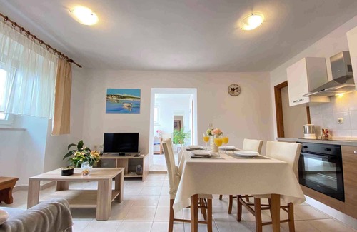 The holiday apartment is located in a detached single-family home and is furnished in a modern and functional style. The property is located in a residential area, in the town centre. Also due to its quiet and sunny location the domicile is popular. Available for your exclusive use: parasol, barbecue facilities, terrace and garden furniture.LocationŠilo. The holiday apartement is located on a 100 sqm enclosed garden plot with flowers and shrubs, bordered by a wall. The landlord lives permanently in the house, but uses a seperate entrance. The House is located in Šilo, 250m from the sea. Apartment has 2 bedrooms, a living room with a kitchen and dining area and a terrace (10m2). It has air condition. Internet is provided. Pets are allowed. Guests have a parking space. Access is via a side road (asphalted, length 30 m). Parking (for 1 car) is available on the property. Specialair conditioning.Facilities: internet access (WLAN) and washing machine. TV reception takes place via satellite. Dogsallowed, EUR 10.00/pet per day. DistancesShopping 350 m, restaurant 400 m, town center 300 m. discotheque, bank each 15 km in Malinska. Main road 70 m. In summer: Adriatic Sea 250 m in Silo (beach 250 m in Silo featuring stones, rocks and bathing plateaus). DivisionHoliday apartment, 1 floor, 3 rooms (including 2 bedrooms), 57 sqm, in total 6 beds (including 1 additional bed). RoomThe entrance to your holiday apartment is located on the ground floor, is at ground level and leads directly into the vestibule. Bedroom with 1 double bed and 1 single bed. Bedroom with 2 single beds. Living/bedroom with 1 additional bed on couch/sofa, sitting area, TV and access to the terrace (5 sqm, garden furniture). Cooking nook in the living & bedroom with dining area (4 seats), electric stove (4 plates), oven, extractor hood, fridge and coffee machine. Bathroom with washing machine, shower, 1 washbasin, WC and window. Terms of lease and pricesIncluded in the priceinternet access, air conditioning, parking place, electricity, gas, water, final cleaning, bed linen, Wireless Internet access. Side costs-Additionally(Payable when booking)/additonal fee for short-term stays (less than 4 nights) obligatory 30% per stay. local tax.Costs on the spot:/Obligatory:registration fee 4 € per person per stay.Deposit:EUR 150,-/object
