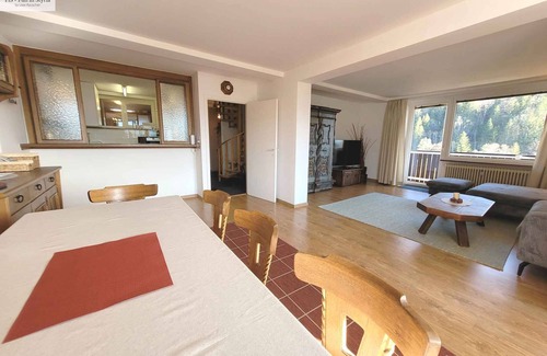 The holiday apartment is located in an apartment house built in 1970, was renovated in 2015 and is furnished in a rustic, functional and typical country style. The property is located in a holiday resort. Also due to the view over woods from the property and its sunny location at the edge of the forest the domicile is popular. Available for use: garden furniture. Cleaning utensils, toiletries and groceries are to be brought along and are not provided.Holiday resort18 accommodations, 86 beds, lobby and ski room. Payment by debit card or in cash. LocationBad Mitterndorf, district Bad Mitterndorf, 810 m above sea level. The holiday apartement is located in a holiday complex, on a open plot with meadow and trees. Access is via a side road (asphalted). Snow chains are recommended in winter. Parking is available on the property. Specialcentral heating (gas).Facilities: internet access (WLAN). TV reception takes place via satellite. WellnessIn the complex: sauna. Dogsnot allowed. DistancesShopping 2 km, restaurant 1000 m, town center 2 km. Bad Mitterndorf: doctor, bank each 1000 m. pharmacy 2 km and railway station, thermal bath, indoor swimming pool, sauna each 3 km. cinema in Liezen 30 km. airport in Salzburg 99 km. discotheque in Tauplitz 10 km. Railway line 3 km. Main road 2 km. Children's playground 2 km. In summer: Ödensee 10 km in Kainisch (beach 10 km in Kainisch featuring meadow, sand, gravel, stones and rocks). diving, water sports, boat launch each 25 km. golf in Bad Aussee 12 km. Bad Mitterndorf: tennis, mini golf, horse riding each 2 km. dog beach, fishing, boat rental each 3 km. In winter: Ski lift 5 km in Bad Mitterndorf. Ski area 5 km in Bad Mitterndorf (Die Tauplitz). ski bus 1000 m. ski rental, ski school, trail, ice skating each 2 km in Bad Mitterndorf. sledge slope in Tauplitz 10 km. DivisionHoliday apartment, 2 floors, 4 rooms (including 3 bedrooms), 130 sqm, in total 8 beds (including 2 additional beds). RoomThe entrance to your holiday apartment is located on different floors and leads over 40 steps directly into the vestibule with wardrobe. The entrance to the apartment is on the 4th floor - there is no elevator in the house.Upper floor: Bedroom (20 sqm) with 1 double bed, TV, access to the balcony (covered, together with living room / bedroom) and eastbound. Living/bedroom (40 sqm) with 1 additional bed on couch/sofa, sitting area, TV, radio, CD player, dining area (8 seats), access to the balcony (covered, garden furniture) and Direction to the south and east. Kitchen (5 sqm, not heatable) with electric stove (4 plates), oven, extractor hood, dishwasher, fridge (icebox), microwave, coffee machine, toaster, electric kettle, washing machine and dryer. Bathroom (5 sqm) with bathtub with shower facility, 1 washbasin, WC, hairdryer and window. Top floor: Bedroom (30 sqm) with 2 single beds and 1 additional bed on bed (smaller 2.00 x 0.90 m). Bedroom (20 sqm, walk-through room) with 1 double bed, access to the balcony (covered) and eastbound. Bathroom (5 sqm) with shower, 1 washbasin and WC. Credit cardsVisa, MasterCard, Eurocard. Terms of lease and pricesIncluded in the pricesauna, internet access, ski bus, parking place, sauna, electricity, water, heating, local tax (under 15 years), Ski bus (30.11.25-31.03.26), Wireless Internet access. Side costs-Costs on the spot:/Obligatory:registration fee 60 € per object per stay. final cleaning 130 € per object per stay. laundry package (bed linen, hand towels beach towel) 25 € per person per first time use and changing. local tax by local tariff.Deposit:No deposit.