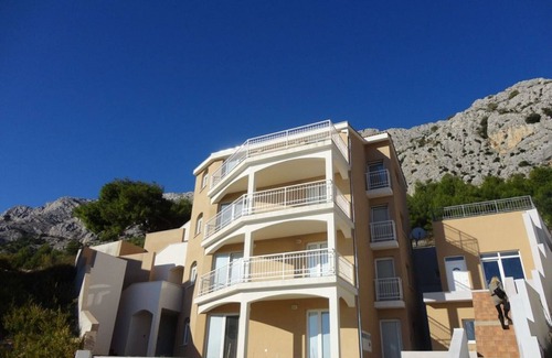 The beachfront apartment is located in Mimice, a small seaside resort on the Omis Riviera.
