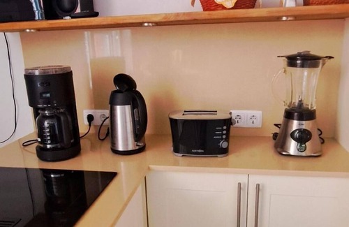 Bed linen and kitchen towels are provided. The kitchen is equipped with pots, crockery, cutlery and some kitchen utensils, such as cooking spoons, spaghetti spoons, can opener, grater, garlic press, Tupperware.