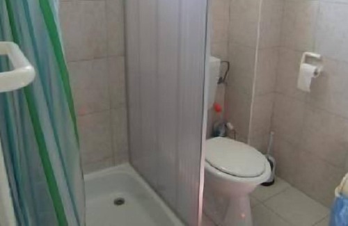 Bathroom with: shower-bath and toilet.