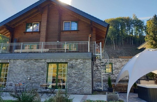 The well-kept house was newly renovated in 2016 and extends over three floors with a living space of 300 m². While the first and first floors form a shared, fully equipped living unit, the ground floor is available as an independent holiday flat that can be accessed from the outside. At this point, the entire house is offered to you as a combination of both residential units. In total, you are offered five double bedrooms, an adjoining children's room with bunk beds, two first-class equipped kitchens, two living and dining areas each with a cosy Biofire stove, a spacious full bathroom, a shower room with infrared cabin and two guest WCs. The comfortable facilities include a flat-screen TV with satellite TV, radiators or underfloor heating in all rooms, free Wi-Fi internet connection, washing machine, bed linen included and towels on request for a fee. On arrival, all beds are freshly made and a towel (50 x 100 cm) is provided for each guest. The upper accommodation unit, the wooden chalet, is very attractive and completely panelled with logs, so that nature is truly brought into your home. As described above, the interior is divided into a first floor, which is accessible from the outside. This is where the communal areas are located, such as the spacious living and dining room, the separate kitchen, a guest WC and the staircase to the first floor. The first floor is located under the sloping roof and offers three bedrooms, a children's room and a full bathroom. The bedrooms are each furnished with a 180 cm x 200 cm double bed and always have a wardrobe to store your travelling wardrobe. From the first bedroom you can access the balcony and the children's room. Here there is a bunk bed with two sleeping areas of 90 cm x 200 cm each. The bathroom has a shower cubicle, a corner bath, a wash hand basin and a WC. Take a seat at the solid dining table in the living area on eight high-backed leather chairs and enjoy a meal together. Passing the Biofire stove, you reach a comfortable sofa set, where a flat-screen TV with satellite TV provides entertainment in the evening. The providers reserve the right to personally confirm group enquiries. The villa is not suitable and intended for stag parties, skittles parties etc. The lower accommodation unit is more simply designed in a modern country house style. The floor is fully tiled and is kept at a pleasant temperature by underfloor heating. The room layout consists of two bedrooms with 180 cm x 200 cm double beds and wardrobes, a living area with dining table and adjoining semi-open kitchen, a guest WC and a shower room with infrared cabin for two people. This flat also has a solid dining table for four people by the Biofire stove. A highlight is the spacious kitchen with everything a hobby chef's heart desires: generous work surfaces, a fridge-freezer combination, a cooker with ceramic hob and oven, a dishwasher, a washing machine and the usual small electrical appliances such as a coffee machine, kettle, toaster and microwave. The kitchen in the wooden chalet is no less equipped for your comfortable and extensive self-catering. The shower room has a walk-in shower with a glass shower partition, a WC and a wash hand basin. The infrared cabin is also integrated in this bathroom.