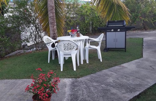 The outdoor area invites relaxation with a delightful terrace where you can enjoy your morning coffee and views of the well-maintained garden. The shared swimming pool is open year-round, perfect for cooling off under the warm Caribbean sun.