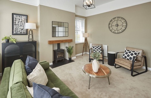 The immaculately presented kitchen includes a large oven, hob, microwave, toaster, kettle, fridge-freezer and dishwasher so you can cook easily during your stay. The roomy breakfast bar style dining area includes eight bar stools so you can sit back in comfort.