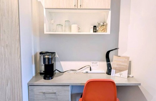 A microwave, Keurig coffee machine, and a mini fridge. This space is set up to prepare a quick and easy meal. The suite does not include a stove/oven, or separate bedroom.
