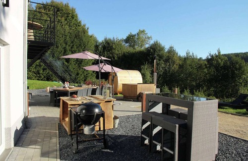 Surrounded by forest on the edge of Montleban, this 8-bedroom villa in Houffalize offers a luxurious and nature-rich retreat for up to 18 guests. Perfect for large families or group getaways, it features a hot tub with valley views, a barrel sauna, and a spacious terrace with barbecue and outdoor bar.