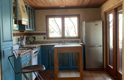 Step out into saguaro forests & trails. The casita is on a deep Canyon's edge and is filled with custom furniture, a well stocked full kitchen and can seat 5-6 for a sit-down meal. One can stretch-out and nap on the banco. It has a well equipped kitchen with a butcher block table and stools.