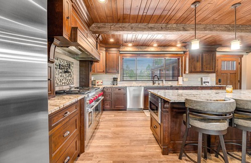 Escape to a world of wonder at this 5,000 sq ft home nestled in the woods! Enjoy a gigantic patio with plenty of outdoor dining areas and a gas grill - exactly what you need for warm-weather cookouts with the family. The firepit offers another great spot to gather and have a great time with your loved ones. Roast some s'mores and don't even worry about getting s'mores goo all over you - the on-site washer/dryer will take care of that for you. This newly built (2021) home away from home boasts a private outdoor hot tub for endless relaxation, a grand great room with floor-to-ceiling windows, a gas fireplace, and endless comfortable sofas, an open and well-appointed kitchen with all stainless steel appliances and a dining table that seats 16, and a rec room with a bar and pool table.