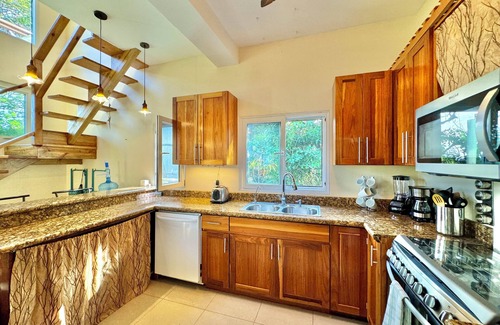 Back at the house, enjoy the refreshing breeze and beautiful views from the comfort of the patio or one of several furnished decks. Inside, big windows and tall ceilings fill the space with abundant natural light, creating a charming space to read, nap, or enjoy a good movie. The kitchen is fully equipped with appliances and cookware, the house has a flat-screen TV, free WiFi for Netflix, board games, and indoor air conditioning to ensure a comfortable and pleasant stay.