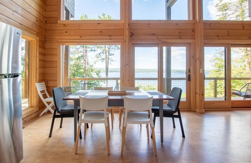 Experience comfort, contentment and joy at Hygge on Seneca. This recently built home is a Pluspuu home as seen in Dwell Magazine. Nestled within a tranquil forest overlooking Seneca Lake, this sustainably built Scandinavian inspired log home will immediately welcome you to a stay of relaxation, privacy and beauty. Stellar west facing views of the lake can be seen from the great room that is an open concept living area combining kitchen, leisure and dining areas clad entirely of glass. Enjoy the memorable sunsets from the wrap around deck or from the comfort of the couch. Adding to the coziness are the comfy couches, ample additional seating, plush rugs, soft cork flooring, sauna room and hot tub.