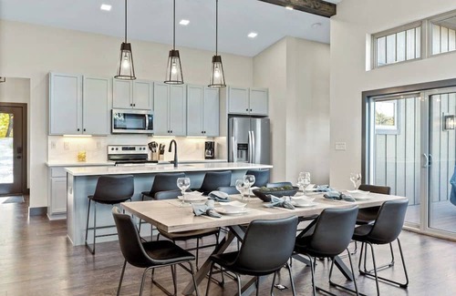 This treehouse-style residence boasts a master bedroom with a king-size bed (complete with a full-size pull-out bed) and an ensuite private bathroom. Two additional bedrooms, one with a king bed and the other with a queen bed and a twin XL bunk, share a full bathroom. For added accommodations, a sofa pull-out bed graces the living room. All bedrooms in this property are located on the Main Floor. The spacious great room features a captivating stone, wood-burning fireplace casting a warm, inviting glow for those evenings of relaxation with loved ones. Culinary aficionados will adore the high-end kitchen finishes with modern appliances, setting the stage for crafting unforgettable meals with family and friends. The residence provides a washer and dryer accessible for the convenience of its guests. This one-of-a-kind treehouse-style abode is a dream retreat for families seeking a magical vacation. The open concept and oversized windows are perfect for entertaining and enjoying nature's tranquil settings at its finest. In addition to the already splendid features, this treehouse also includes a pack-and-play, baby gate, highchair, and baby monitors.