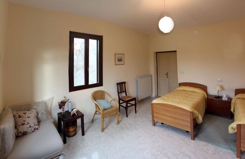 There are two steps up to the front door and lobby with a compact but fully equipped kitchen on one side and a shower room on the other. A further step takes you to the main open plan living and dining room. This main room offers a wood burning stove, well placed large dining table and relaxing seating area. Beyond this are two large bedrooms. The master room with king size bed offers views to the tallest peaks in the Appenines from the bed and lots of storage space. The second is a twin room with beautiful rural views, comfortable single beds, a third pull-out chair bed and a large wardrobe.