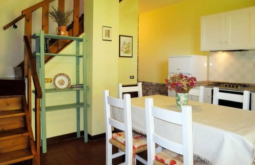 "Il Monte", 4-room semi-detached house 62 m2 on 2 levels. Rustic furnishings: living/dining room with kitchen corner. Exit to the garden, to the loggia. 1 double bedroom. Kitchenette (oven, dishwasher, 4 gas rings, freezer) with dining table. Shower/bidet/WC. Upper floor: 1 room with 2 beds. 1 double bedroom. Exit to the garden. Shower/WC. Gas heating. Terrace roofed. Terrace furniture. Beautiful view of the countryside. Facilities: Internet (WiFi). Please note: non-smoking house. Maximum 2 pets/ dogs allowed. Private entrance.
