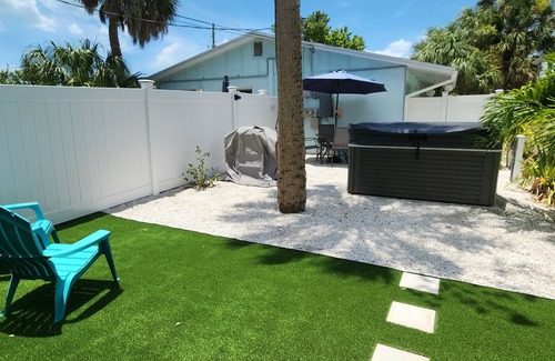 Beach Cottage steps away from Beach Access on 15th ave Indian Rocks Beach! Two Bedrooms one bath, Washer and Dryer, all toiletries and cleaning supplies included and when available enviromentally friendly as we order supplies from Grove Collabortive! Our kitchen is fully stocked with anything you might need even a crockpot foryour short or extended stay. We provide a wagon with beach equipment (beach chairs, toys, large umbrella,cooler) outdoor sitting for didning, Gas Grill, outdoor sitting for dining and Large tropical yard for you to enjoy games and play with your pet! Yes we are pet Friendly! One bedroom features a King Bed with soft crisp linens, closet and a smart tv... Second Bedroom a Queen bed, closet and smart tv. The living Room has a comfortable sleeper sofa. Dining for four guest at the dining table and you can add a fifth. Located just steps from Hurricane Eddys and walking distance to Guppies, Keegans, Chicago Jacks and more! Cleaning fee is $100 if only booked one night there after $200 and pet fee is $200 plus tax charge will be adjusted after booking. 40pd weight limit Booking fee is not refundable once paid via credit card.