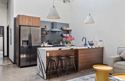 Come and relax in our new location! This historic warehouse was converted into apartments but still holds its original architectural features! Enjoy the industrial modern aesthetic with 15-foot-high ceilings, brick walls, original concrete floors, and atrium skylights with natural light. These units come fully furnished and most have full kitchens and all your required accessories for you to just drop your suitcase and start relaxing. **NOW PET FRIENDLY-$50.00 PET FEE PER STAY**