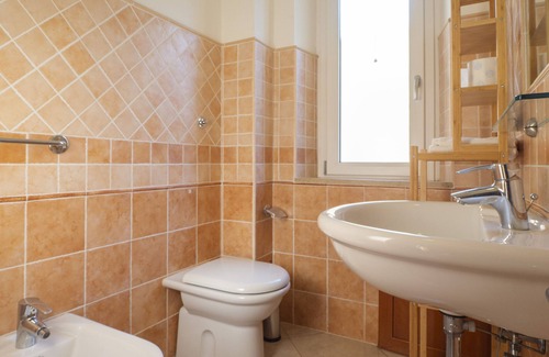 The apartment has a full bathroom with a modern shower, toilet, sink and bidet. The bathroom is functional and well-finished, with a simple but elegant style that completes the welcoming atmosphere of the apartment.