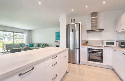 The open kitchen, with induction hob, is equipped with refrigerator, microwave, oven, freezer, washing machine, dishwasher, dishes/cutlery, kitchen utensils, Nespresso coffee machine, toaster, kettle and juicer, ....