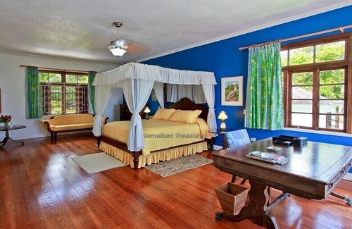 Jasmin Hill Villa is very stylish and graceful, with attractive, spacious rooms and lovely décor. The extra-large rooms have ceramic tile or hardwood flooring. The home is filled with English antiques, books and original artwork. The wooden shingle roof and classic stucco villa in Jamaica was constructed in the 1940's.