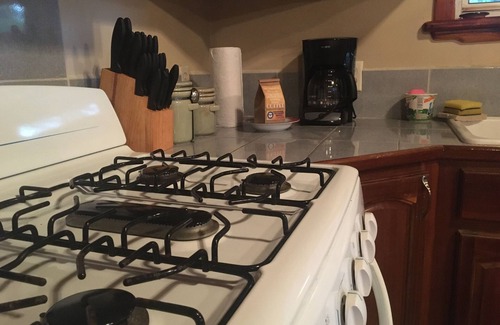 The kitchen is equipped with a six burner stove with a full oven, a standard refrigerator, and ample counter space. Delve into the lower cabinets and you'll find everything you need to prepare a simple snack to a full meal, all in the comfort of your own vacation rental.