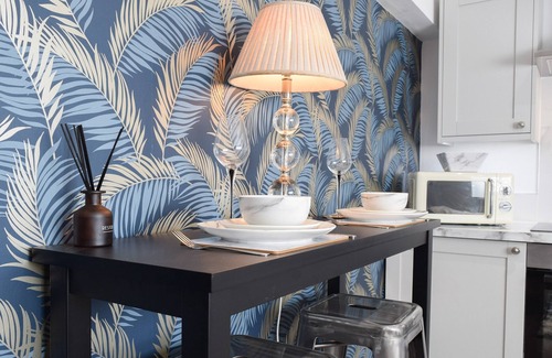 Bedroom: With double bed and en-suite with shower cubicle, toilet and heated towel rail.. Electric central heating, electricity, bed linen, towels and Wi-Fi included. Front garden with patio and garden furniture. Private parking for 1 car. No smoking. Please note: Holidaymakers, couples and families only. . Beautifully presented, boutique-style accommodation ideal for both short getaways or longer breaks, and is decorated for Christmas breaks. This very comfortable one-bedroom property is set within the grounds of the owner’s family home where you may even meet the friendly family dog. On the ground floor, the open plan kitchen and living room gives you space to relax after a day exploring, with a choice to cook a meal in or visit one of the local takeaways, pubs or restaurants just a short walk away. Upstairs you are met with a lovely double bedroom with access to the en-suite shower room. You can enjoy an evening tipple in the private courtyard style garden which enjoys the sunshine on a bright day.