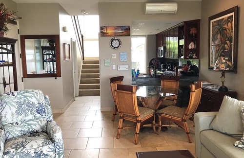 2-Story Townhouse (2nd floor/3rd floor), 1150 sq. ft., Bridge unit means NO stairs to enter onto second floor), 1 bedroom, 2 baths, Sleeps 4 ; 1 king bed in master bed room and queen sofa bed down stairs, granite counters, A/C, fans, tile floors, stainless appliances, fully equipped kitchen, TV, landline phone, internet , expansive ocean views!