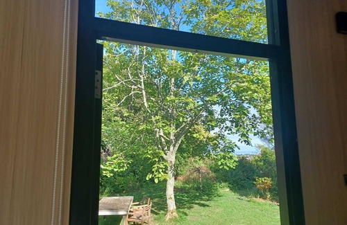 A cozy 139-square-foot tiny home that offers a private space in a beautiful garden location with ocean views and a backdrop of the Kaitake Ranges. It features convenient access to UV-filtered water, split air conditioning, a kitchenette, cooking equipment, and excellent bathroom facilities. These amenities include an eco-friendly cassette toilet with a removable waste holding tank, hand basin, and shower (gas-heated for hot showers).