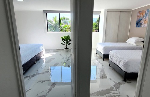 Unwind in our sunlit 2BR apartment. Boasting a king bed, 2 twin beds, office with 200mb/s WiFi, 70" smart TV, washer/dryer, dishwasher, small oven and secure parking. Minutes from UVA Park, El Tesoro, Santa Fe malls, Provenza area, and Parque Lleras. Close to groceries and eateries. Perfect for a luxurious, extended stay in the heart of Medellín, 30min from airport. Relish the comforts of our newly furnished, stylish haven in a prime location. Your unforgettable Medellín experience starts here!