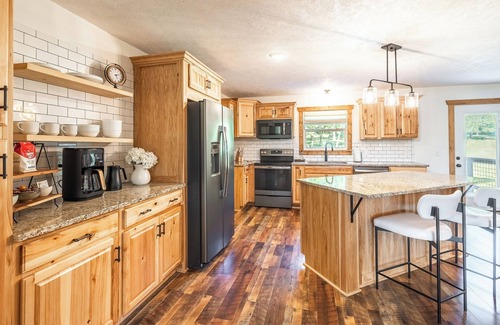 Step inside and discover a welcoming space designed for comfort and convenience. The open-concept living area invites you to kick back and relax after a day of lakeside fun. Sink into the cozy "cuddler" leather sofa and catch up on your favorite shows on the 75 inch tv with surround sound, or gather around the dining table for a family meal or quick snacks in between lake excursions, prepared in the fully equipped kitchen, including the basics coffee maker/toaster/tea kettle to a Ninja blender & margarita maker.