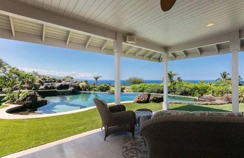 Tropical oasis with natural lava rock, salt water, infinity-edge pool, massaging bubble bed and waterfalls give the guest a feeling of vacation paradise! Located in the desirable Heather's section of Kohala Ranch, enjoy coastline and mountain views, whales breaching and spectacular sunrises and sunsets. Enjoy indoor/outdoor living and easy entertaining with 1000 feet of covered lanai which includes a wet bar and under counter refrigerator with two ceiling fans to keep the breezes flowing. An open floor plan allows you to be busy in the kitchen and still socialize with your guests. A very comfortable Two bedroom master suites and a third bedroom with two twin beds. We named our vacation rental Makaleha Hale which in Hawaiian means To wonder at: to admire or admiration. When sitting poolside there is an abundance to admire. Seclusion and nature abound...