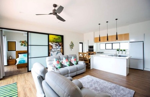 Konoha Escape with Aircon in the lounge, Unlimited Internet, Fenced pool, Playground, Smart TV, Secluded outside bath area, outside entertainment area, oven and cook top, microwave, fridge & washing machine.