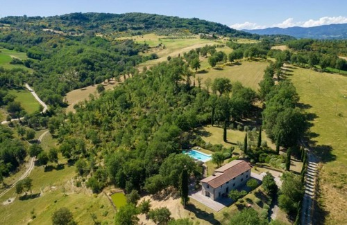 Beautiful, carefully restored country house, located in the middle of the green hills of Mugello between Vicchio and Dicomano. Manor house "La Badia", 300 m a.s.l.. 4.5 km from the centre of Dicomano, 38 km from the centre of Firenze, in a quiet, sunny, elevated position, in the countryside. Private: property 8'000 m2 (fenced), swimming pool (6 x 12 m, depth 120 - 220 cm, seasonal availability: 01.Apr. - 31.Oct.). Paddling pool, outdoor shower, garden furniture, barbecue. In the house: central heating system, heating to be paid on the spot, heating available only from 01.Nov. - 04.Apr.. Motor access to 500 m from the house (via unmade road). Parking on the premises. Shop 4.5 km, grocery 4.5 km, railway station "Dicomano" 4.5 km. Broad view of the valley. Fenced garden with paddling pool (3 x 3 m, 0.75 m deep). Trips possible on foot or on horseback.