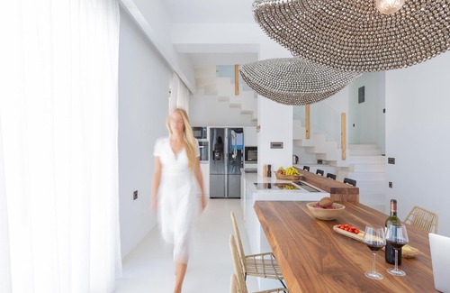 The villa offers five sumptuously styled bedrooms and four refined bathrooms, combining Italian craftsmanship with contemporary flair. The interiors are curated with cocomat linens, Dunlopillo mattresses, designer lighting, and bespoke walnut wood finishes, ensuring relaxation at its finest. The villa can accommodate up to 10 guests in real beds, while two additional guests can be accommodated on single sofa bed/futons in two of the bedrooms, making it an ideal option for larger families or groups of friends. The maximum capacity is 12 guests.