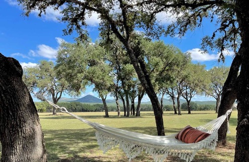 Three shaded patios surround the home, complete with comfy furniture (including rocking chairs where you can enjoy a cup of morning coffee while watching the sun peek over the mountains), outdoor lighting, and amazing panoramic Texas Hill Country views! Swing away a quiet moment on the hammock or porch swing. After a fulfilling day, gather round the fire pit for relaxing conversation. The fire pit's great for snacks, but for heartier appetites, there's a charcoal grill, too! Smoking's allowed, but only around the fire pit area outside.