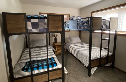 Cabin is located on a beautifully wooded two-acre lot on Whitefish lake.New flooring (carpet and wood in kitchen/bath/laundry), paint and mattresses.Close to downtown Whitefish (dedicated biking/walking trail to downtown across the street) and at the base of road leading to Whitefish Ski Resort.Patio with adirondack chairs, hot tub and area for outdoor dining.Master bedroom located upstairs with king size bed and bathroom.Two bedrooms down with 4 bunks in each room and bathroom.