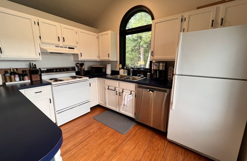 The master bedroom features a king bed with an incredibly comfortable memory foam Casper mattress. This bedroom includes a private bathroom and shower. The second bedroom includes two bunk beds. A second bathroom and shower is located in the main area of the house. A queen sized sleeper couch is in the living room. The cottage sleeps up to 8 people comfortably.
