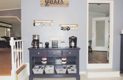 Upstairs you’ll find 1 of the master suites with a full bath including a new large soaking tub. This room also has french doors leading to a large upper deck and casual sitting area overlooking the lake. The 2 guest rooms and the full bathroom are also upstairs, along with a comfortable living room and a separate dining room with seating for 12. There’s also a cozy sitting area with a fireplace adjacent to the large kitchen so it’s easy to entertain and be a part of the conversation while whipping up a quick snack or full family dinner. The kitchen includes a beautiful extra-large butcher block island, which offers great storage, plenty of prep space and seating for 8. There's also a coffee bar with both a drip and a Keurig coffee maker and shelves below for food storage if needed. The owners enjoy hosting large family dinners here so you should find it well equipped for your needs with plenty of dishes, utensils and gadgets, along with a few “home” touches such as an InstaPot, 3 crockpots, large griddle, 2 waffle irons and ice cream maker. The gas grill is on the upper deck right off the kitchen where there's an additional seating area offering a great option for lazy summer evenings.