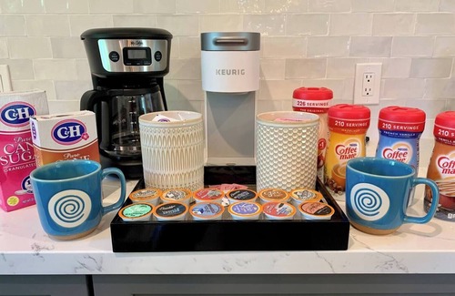 Newly remodeled bathrooms with marble floors, stunning tile work and plush luxury towels. Ensuite bathroom has a large freestanding soaking tub. Stacked with luxury amenities, we provide all the following complementary to each of our guests: Shampoo, conditioner, body wash, q-tips, makeup wipes, cotton swabs, tissues, wash clothes, abundant towels, body lotion, both liquid hand soap and bar soap, and hair dryers.