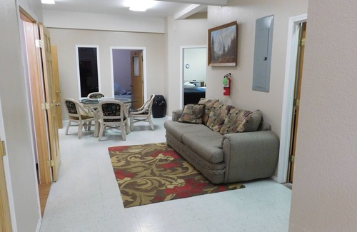 We offer accommodation for groups of 1 to 40 people with affordable and comfortable amenities perfect for singles or a group of people looking to do reunions or wedding parties. This unit is on the main floor has 19 beds (10 Queens, 3 doubles , and 6 singles). If needed there are 3 two bedroom condos upstairs. The building is right across the street from Flathead Lake with a great central location in town. Within walking distance to the Kwa Taq Nuk Resort, Flathead Boat rentals, downtown Polson, several public beaches, restaurants, and bars. Great views of Flathead Lake and at least three mountain ranges including the Mission Mountains. Property comes fully furnished with washer and dryer, kitchen, two baths, 2 refrigerators, and an outdoor grill. All sheets, towels, pots and pans, everything that you should need except your toothbrush. There is a private day use boat dock across the road.