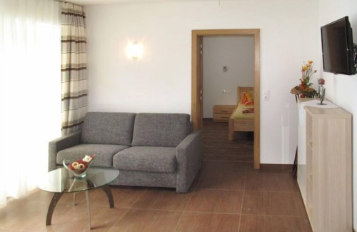 "Leonie", 2-room apartment 60 m2, on the ground floor. Beautiful furnishings: living/sleeping room with 1 double sofabed, dining nook and satellite TV (flat screen). 1 room with 1 double bed and shower/WC. Kitchenette (oven, dishwasher, 4 ceramic glass hob hotplates, toaster, kettle, microwave, electric coffee machine). Underfloor heating. Parquet floors. Terrace partly roofed. Terrace furniture. Facilities: children's high chair, baby cot. Internet (WiFi, free). Please note: non-smokers only. When there are less than the maximum number of guests staying at the property, not all of the housing units will be available for use.