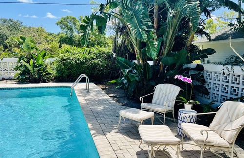 Enjoy this 1940's coastal home in a tropical setting with resort style pool, stylish interior, and plenty of privacy.