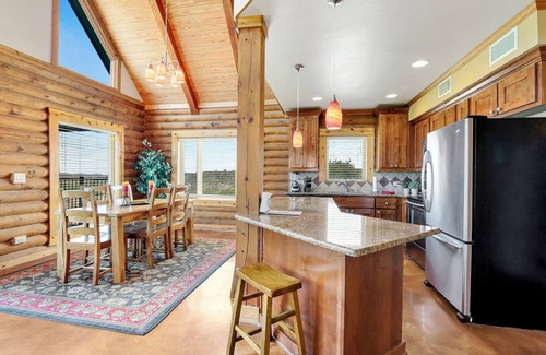"The Log Home" is a testament to rustic elegance, featuring 3 bedrooms, 2.5 bathrooms, and a loft, where every room offers sweeping vistas of the surrounding landscape. Step inside to discover a spacious living area with vaulted wood ceilings, leather furnishings, and a large flat-screen TV—perfect for cozy evenings spent indoors.