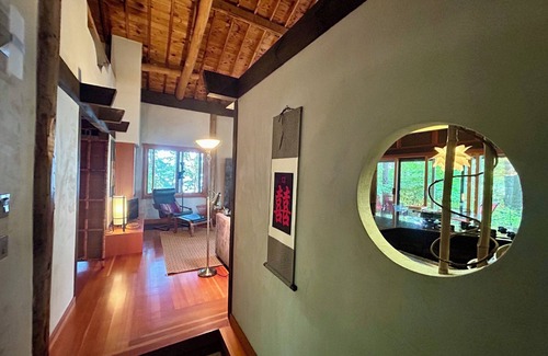 The Teahouse is designed in the style of a Japanese teahouse, featuring an open plan designed to adapt traditional Japanese rural architecture to a wooded lakefront setting with glass sliders, skylights and porches to embrace the natural world. A history of the Teahouse and many more photos of the lake and home can be found on our website LittleSebagoTeahouse.