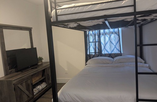 Welcome to this charming cabin in Middletown. This adorable property features 2 cozy bedrooms - one with a queen bed and the other with a bunk bed. With heating, AC, and WiFi available, guests can stay connected and comfortable. The bathroom is equipped for all your needs. We're happy to assist with any questions while you stay at our cabin.