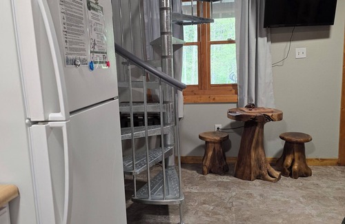 The cabin has 1 bedroom upstairs, the downstairs has 2 bedrooms, living room with electric fireplace, sofa bed, streaming channels, 2 kitchens, 2 bathrooms, and covered porch with outdoor furniture & ceiling fan. The kitchen has pots, pans, plates etc. You will need to bring spices and your food. We have a charcoal grill. Remember to bring charcoal, lighter fluid and firewood. There is a gas station and Dollar General 5 minutes form the cabin. No smoking inside cabins. Smoking is permitted on outside decks. Don't forget you chairs for the fire pit. Swing set for the kids nearby. Games can be found in the cabin and on the porch. Outdoor Library, Hammock Forest and Hiking Trail also on the property!