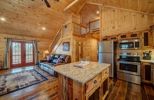 Welcome to Cherokee Ridge Cabin, where cozy cabin comfort, scenic mountain views, and vacation-worthy amenities combine for the mountain getaway of your dreams! This 2 bedroom, 2 bath home with 2 levels is almost too good to be true. Mountain views delight and are viewable from the great room’s double glass doors that open to the covered, full-length porch. You'll feel your cares melt away in the porch's Hot Tub, breathing in the views and the clean mountain air. The cabin seamlessly blends its wood interior and high-end custom cabin décor with modern amenities such as high speed, fiber optic internet, internet TV with Roku, and a game room with a "bar box" full-size pool table, foosball, and ping pong. A full-home generator makes sure the fun doesn't end due to weather - you'll still have water and electricity (even for the hot tub). There's plenty to do, and plenty of ways to enjoy the mountain views while creating memories to last a lifetime. You’ll love gathering around the wood-burning fire pit. Or see the views and relax on the NEW, large lower deck with custom chairs, ambient lighting, and a gas fire pit perfect for swapping stories around. Just 15 minutes from downtown Murphy’s restaurants, shops, and activities, Cherokee Ridge Cabin has everything you’d want for the mountain vacation of your dreams!