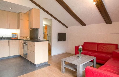 The holiday apartment Alouette *** (66 m2) is located on the fourth floor and is a renovated, spacious apartment for 4-6 people. It has a twin bed room, 1 room with 2 single beds and 2 wall-folding bed in the living area. shower/WC. Bed and bath linen are available and included in the price. Open living / dining area, Flat-screen TV and Wi Fi free of charge. The open kitchen is fully equipped with a ceramic hob, oven, dishwasher, fridge, filter coffee machine. The kitchen is fully equipped and suitable for holidays including kitchen linen. The apartment has a spacious south-facing balcony. Non-smoking apartment. Max. 1 dog allowed - pre-registration required. Ski and boot dryer rooms are available to the guests. Specials: close to the Stafelwald ski area - in-house children's playground with sunbathing lawn - Discount on parking fees.