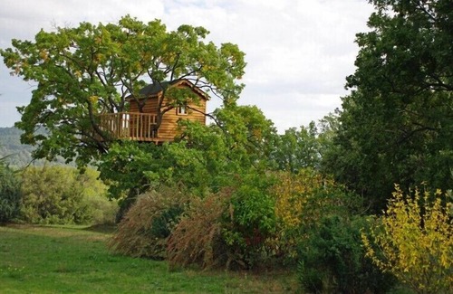 - The hut "LÀ-HAUT" is furnished with a double bed of 140X200, a table and two stools. The 10m² terrace has a table and seating to enjoy the view to 4.5 m high. Given its exceptional location in his oak, the cabin is reserved for persons able to stay perched. Young children must of course be accompanied by adults. The use of all elements at risk such as cigarette, candle, lights, etc. is EXPRESSLY PROHIBITED. The people of hut can use the shower and toilet located 50m into the local pool.