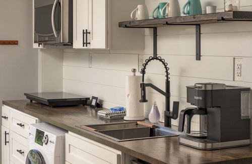 The main level boasts an open kitchen, wood-burning fireplace, half bath, and a spacious dining area for 8. 75in smart TV, laundry, and comfy seating are also provided.