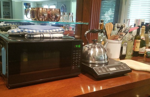 Also included is a Keurig K machine and the coffee K cups; a french coffee press; drip coffee maker, espresso maker, tea kettle, tea carafe